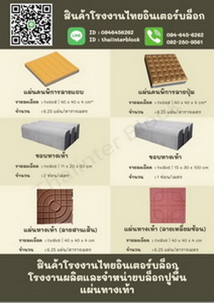 โรงงานไทยอินเตอร์บล็อก ผลิตและจำหน่าย บล็อกตัวหนอน, บล็อกแปดเหลี่ยม , บล็อกปูสนามหญ้า  บล็อกหกเหลี่ยม , แผ่นทางเท้า (มีลายพัดโบก ลายหมากรุก ลายมุมซ้อน ลายสานเส้น ลายเกลียวคลื่น) บล็อกปูพื้น , บล็อกปลูกหญ้า , แผ่นทางเดิน , แผ่นทางเท้าคนตาบอด , แผ่นปูพื้นคอนกรีต , บล็อกปูถนน วัสดุกั้นขอบทางเท้า , วัสดุปูพื้น , ขอบคันหินคอนกรีต  ทนทาน แข็งแรง